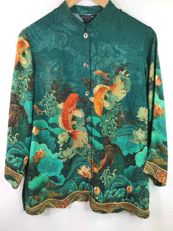 70% Silk and 30% Rayon shirt with button front, narrow stand up collar, 3/4 sleeves, straight hem, 3″ side slits and V-slits on the cuffs. In teal, greens, orange, yellow. Machine wash cold, tumble dry low. Sizes M, L, XL. Made in China and dyed and finished in the USA.