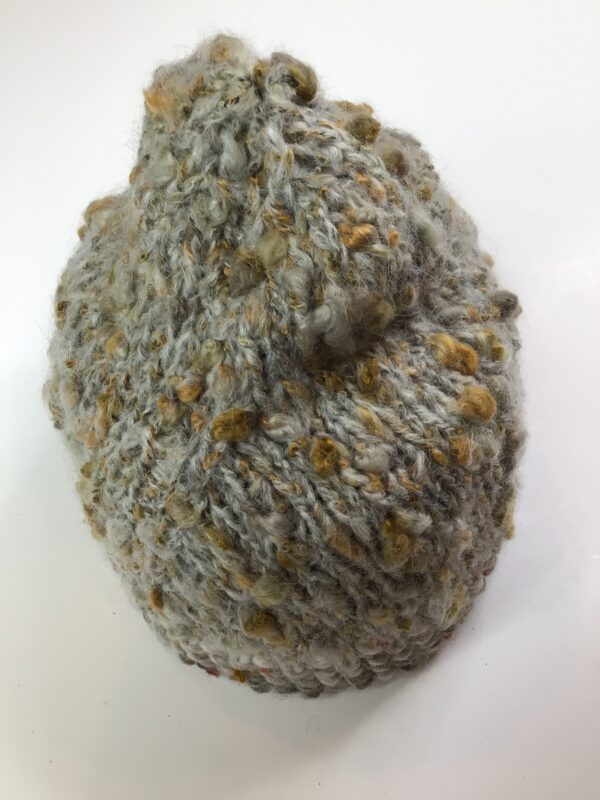Soft and warm, nubby textured, hand knit hat by Kathleen Crawford in ivory and gold. and a ribbed border. Acrylic, mohair and alpaca. Hand wash lay flat to dry. Size Free. Made in W. Virginia.
