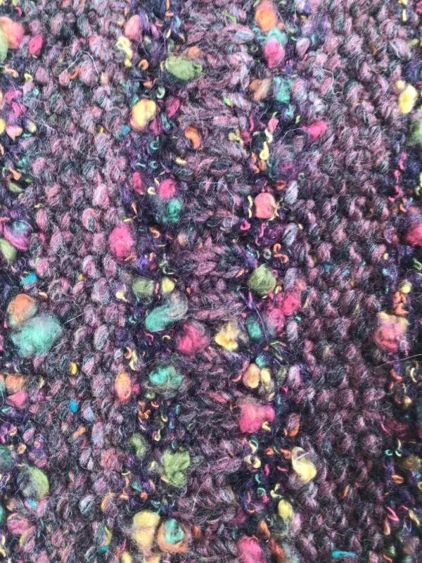 Soft, and warm, hand knit, nubby textured scarf by Kathleen Crawford in stripes of purples with multi color speckles. Acrylic, mohair and alpaca yarn. Hand wash and lay flat to dry. Size (#16-25) 7″ W x 63″ L. Hand made in West Virginia.