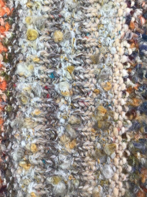 Soft, and warm, hand knit, nubby textured scarf by Kathleen Crawford in ivory, brown, gold, olive, salmon, and colorful small speckles. Acrylic, mohair and alpaca yarn. Hand wash and lay flat to dry. Size (#6-25) 7″ W x 65″ L. Hand made in West Virginia.