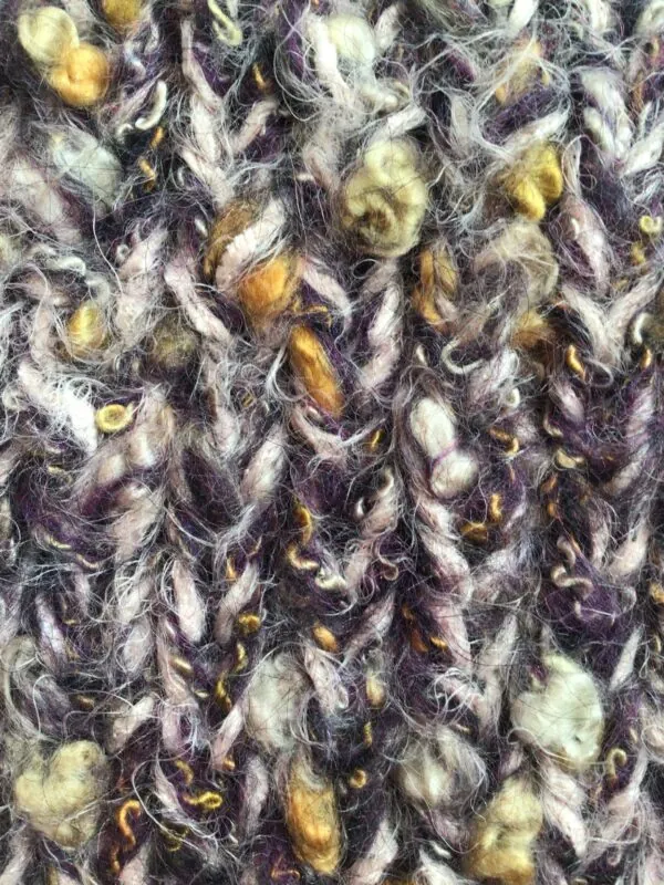 Soft, and warm, hand knit, nubby textured scarf by Kathleen Crawford in ivory, purple and speckled in yellow and gold. Acrylic, mohair and alpaca yarn. Hand wash and lay flat to dry. Size (#2-25) 6″ W x 56″ L. Hand made in West Virginia.