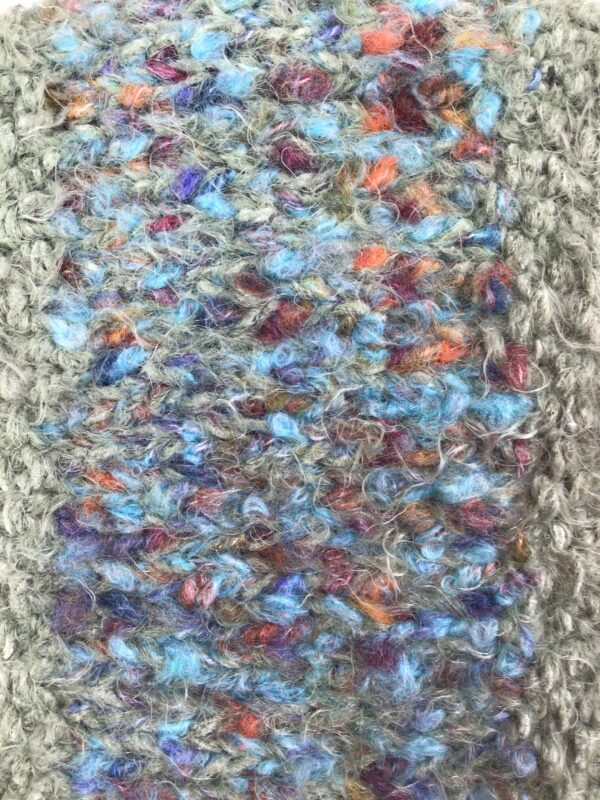 Soft, and warm, hand knit, textured neck gaitor by Kathleen Crawford in stripes of seafood green with a center band of turquoise and blue with multi colored small speckles. Acrylic yarn. Hand wash and lay flat to dry. Size (#1-25) 6″ W. Hand made in West Virginia.