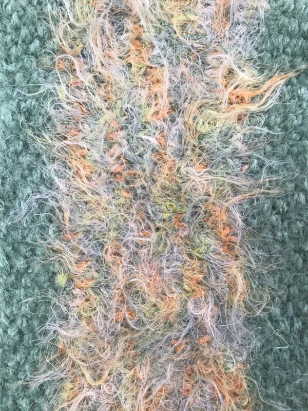Soft, and warm, hand knit, textured neck gaitor by Kathleen Crawford with outer bands of seafoam green and a center band of feathery salmon, soft blues, cream, peach, orange, yellow. Acrylic yarn. Hand wash and lay flat to dry. Size (#2-25) 8″ W. Hand made in West Virginia.