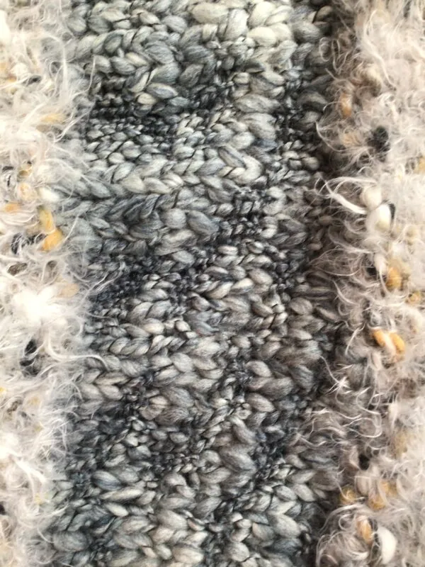 Soft, and warm, hand knit, textured neck gaitor by Kathleen Crawford with outer bands of creamy gray and a center band of nubby shades of gray. Acrylic yarn. Hand wash and lay flat to dry. Size (#3-25) 6″ W. Hand made in West Virginia.