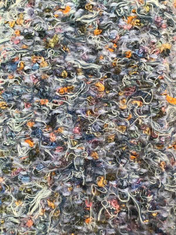 Soft, and warm, hand knit, nubby textured scarf by Kathleen Crawford in a mix of lavender, blues, orange, gold, yellow and cream. Cotton and polyester yarn. Hand wash and lay flat to dry. Size (#25-25) 5.5″ W x 65″ L. Hand made in West Virginia.
