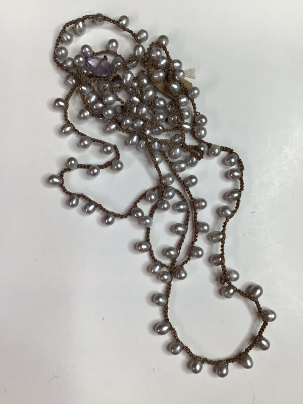 Hand crochet necklace of soft gray freshwater pearls with a amethyst bead loop closure. Nylon. Worn doubled or tripled. Measures 44″. Handmade in Alford, MA.