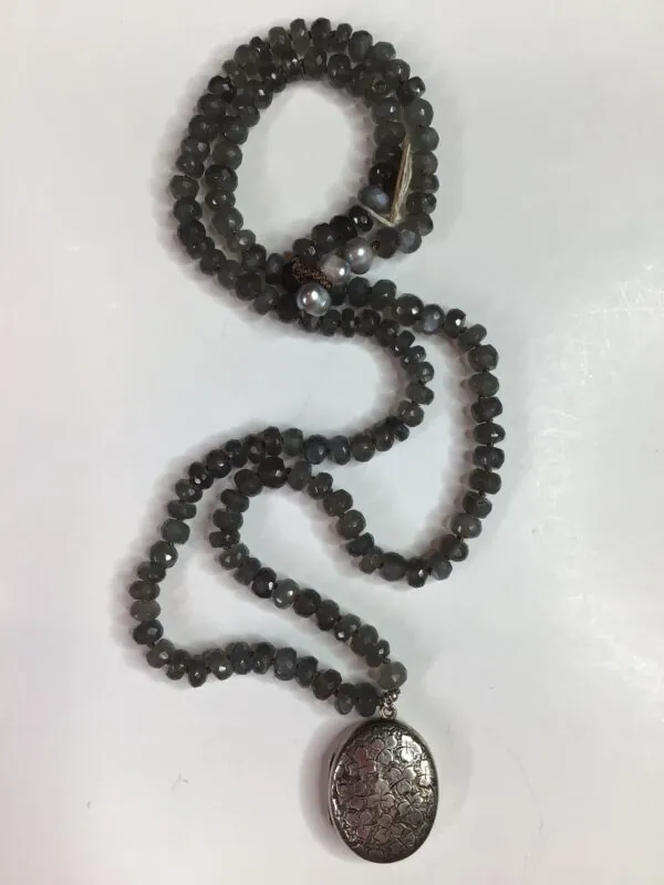 Hand knot gray moonstone necklace with sterling silver vintage floral locket and three soft gray freshwater pearl loop closure. Measures 17″. Handmade in Alford, MA.