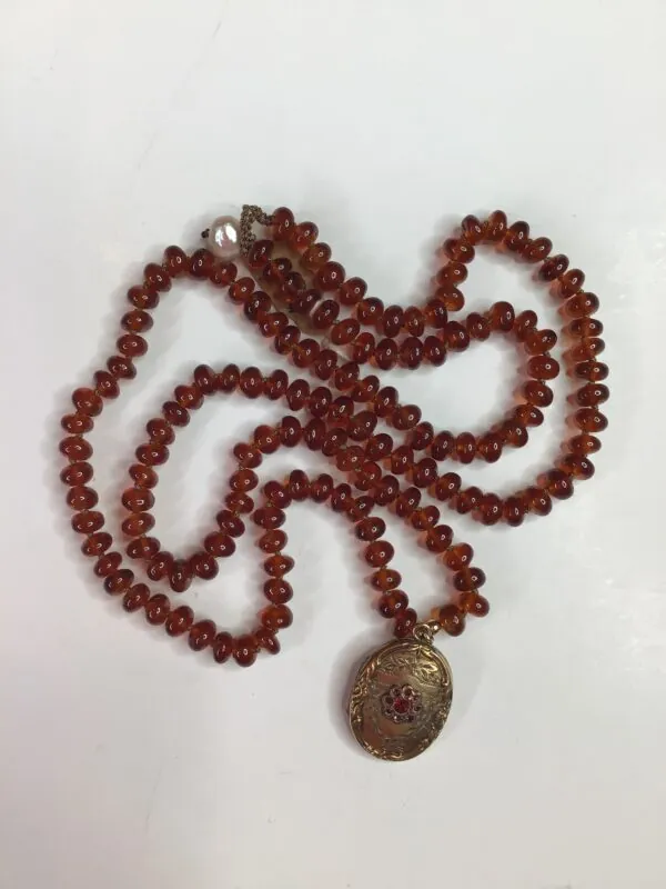 Hand knot smooth garnet necklace with gold filled beads, vintage Victorian locket with garnet paste stones and soft pink freshwater pearl loop closure. Measures 28″. Handmade in Alford, MA.