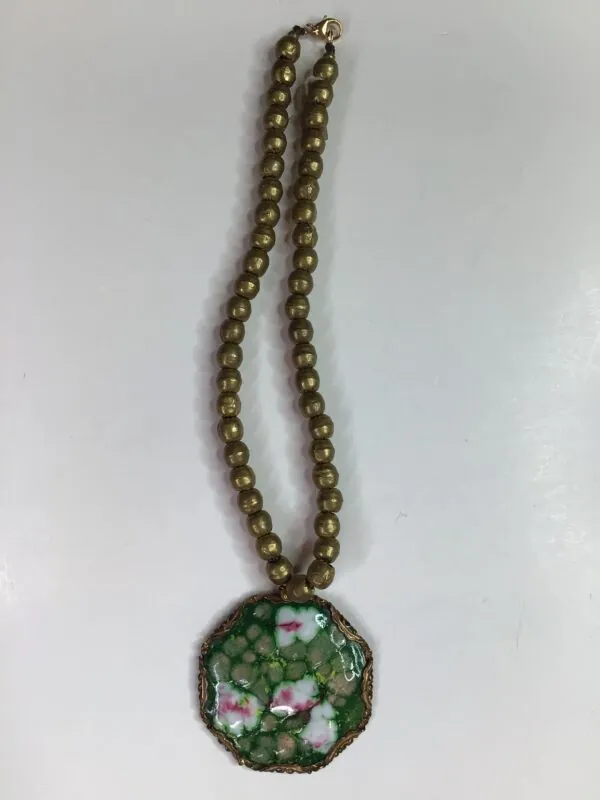 Hand crochet nylon chain with vintage African brass beads and a Miriam Haskell art glass pendant with gold filled clasp. Length 16″ plus the pendant. Hand made inAlford, MA.