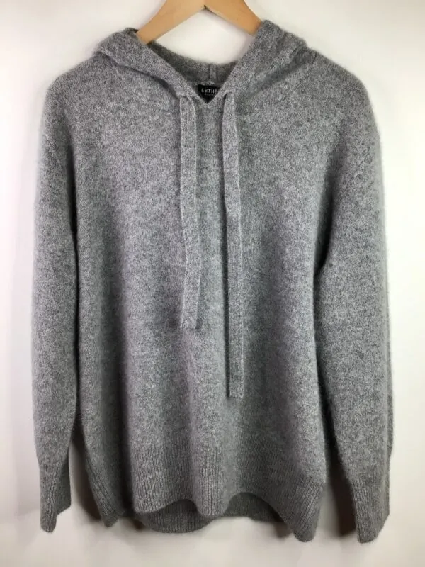 Top of thigh length, hoodie pullover sweater with a straight hemline, knit hoodie drawstring, long sleeves with ribbed cuffs and hemline. Soft, lightweight, warm 60% raccoon, 30% angora, 10% wool. Hand wash. Sizes M, L, XL.