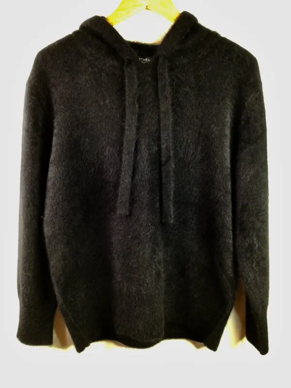 Top of thigh length, hoodie pullover sweater with a straight hemline, knit hoodie drawstring, long sleeves with ribbed cuffs and hemline. Soft, lightweight, warm 60% raccoon, 30% angora, 10% wool. Noir. Hand wash. Sizes S, M, L, XL.