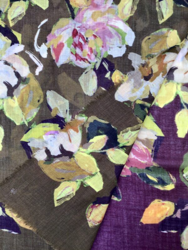 Soft fine merino wool woven scarf with an abstract rose print in browns and purple with yellow, lime, greens, white, pink. Hand wash, line dry.  Size is 25″ W X 72″ L with a soft narrow 1/2″ fringe.