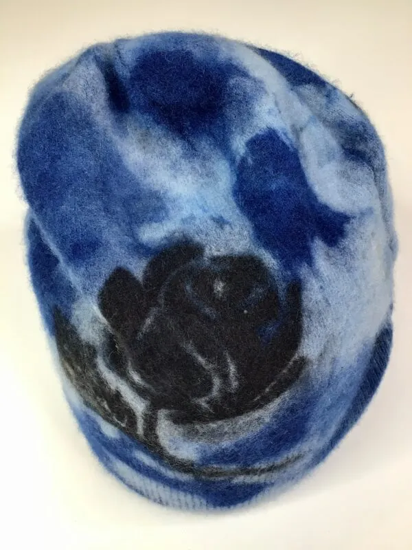 Cashmere hat, super soft, hand dyed made of re-claimed cashmere, decorated with hand stitching and stencil work in blues, black. Hand wash. One of a kind. One Size. Made in Los Angeles, CA.