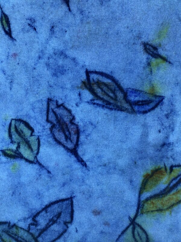 This super soft re-claimed cashmere scarf is hand dyed, pieces are cut and sewn together, decorated with stenciled leaves in blue with blue, gold, rust, green and black. Measures 13″W X 72″L. Hand wash. One of a kind. One Size. Made in Los Angeles,