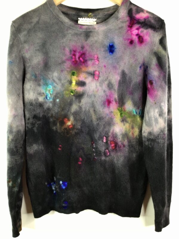 Super soft, warm, hand dyed, reclaimed cashmere fitted crew neck pullover with long sleeves, drop shoulders, ribbing at the hem, cuffs, and neck. Gray, black with colorful bright orbs. Hand wash. One of a kind in size S. Made in Los Angeles, CA.