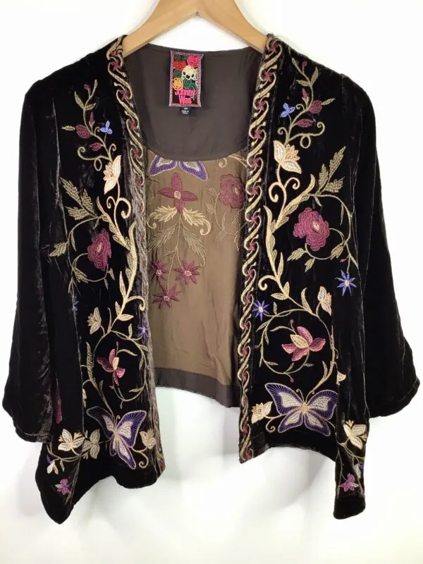 82% rayon and 18% silk open front, bolero jacket with a A-line shape, 3/4 sleeves with slit cuffs, straight hem, waist length, lined. Chocolate brown with purple, pink, white and tan embroidery. Dry clean only. Sizes XS, S. M, L.
