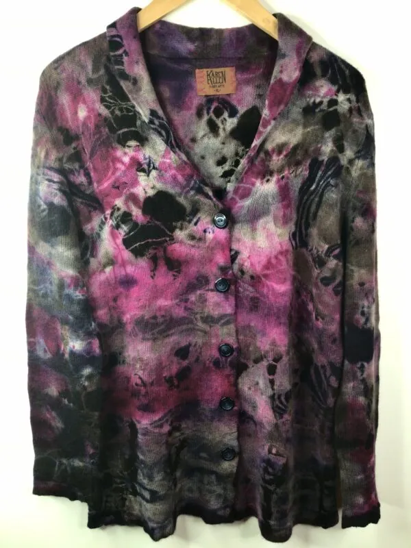 100% Scottish cashmere 5 button cardigan from Karen’s studio in Great Barrington. Hand-dyed by Berkshire dye artist Arline Reilly in shades of gray, pink, green, black, cream. One of a kind. Size XL. Made in Great Barrington, MA