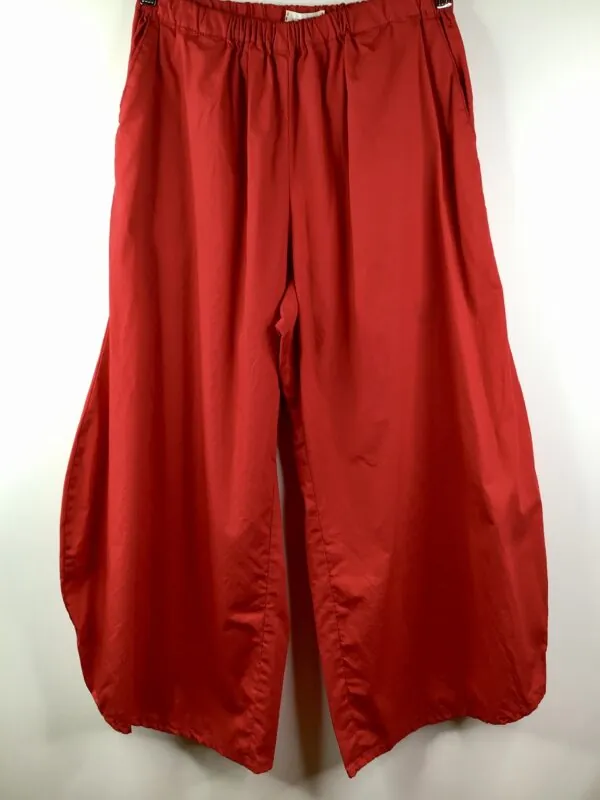 100% cotton broadcloth pants with an elastic waist, side slit pockets, and wide legs, billowing out and then tapering above the ankle.  Loose fitting, relaxed shape.  Machine wash cold, in bag, tumble dry low.  One Size/FreeSize.  Only one in stock.  Designed in New Hampshire, made in India.