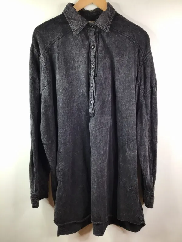 Light cotton spandex jersey henley is oversized with 5 button half front, long sleeves, a wide body, drop shoulders, pointed collar, button cuffs, raw edge rolled hem, knee length. Faded Black. Gentle wash, dry flat. One Size/Size Free. Designed in New Hampshire, made in India.