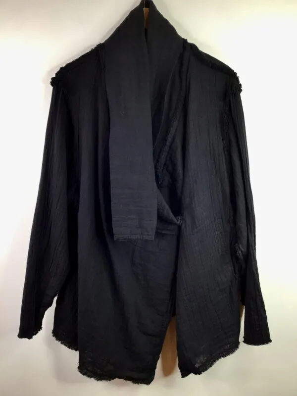 100% double gauze cotton cardigan with front snap, diagonal opening, side seam pockets, outside seams and raw edges on the cuffs and hem, mid-thigh length. Black. Machine wash delicate, in a bag, tumble dry low. One Size/Size Free. Made in USA.