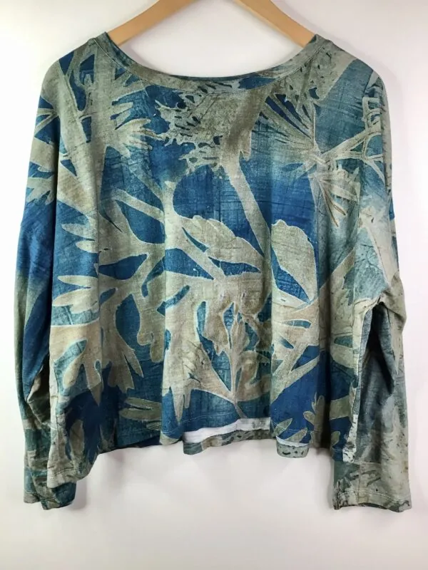 Light cotton spandex jersey crop tee is oversized with long sleeves, a wide body, drop shoulders, round neckline, waist length.  Turquoise, teal and green.  Gentle wash, dry flat.   One Size/Size Free.  Designed in New Hampshire, made in India.