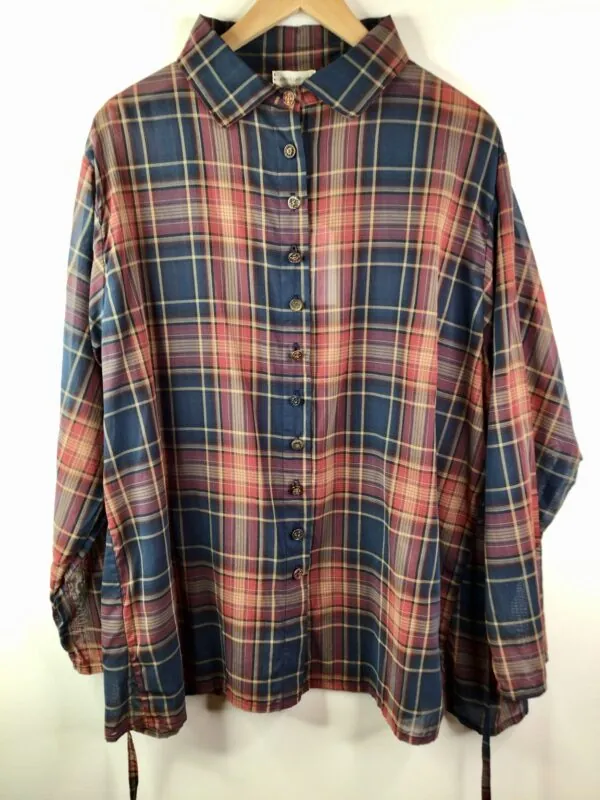 Plaid cotton voile weekender shirt with long sleeves, button front, pointed collar, fabric ties at the waist side seams to adjust the fit top of thigh length. Machine wash cold, tumble dry low. One size/Free Size. Designed in New Hampshire, made in India.