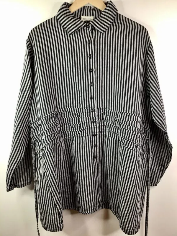 100% linen, Smashed shirt is oversized, has front and back horizontal pleats at the waist line, button front, with a variety of buttons, long sleeves, A-line shape, side seam fabric ties to adjust the fit, mid-thigh length. Black and light gray. Machine wash cold, in a bag, dry low. One Size/Size Free. Designed in New Hampshire, made in India.