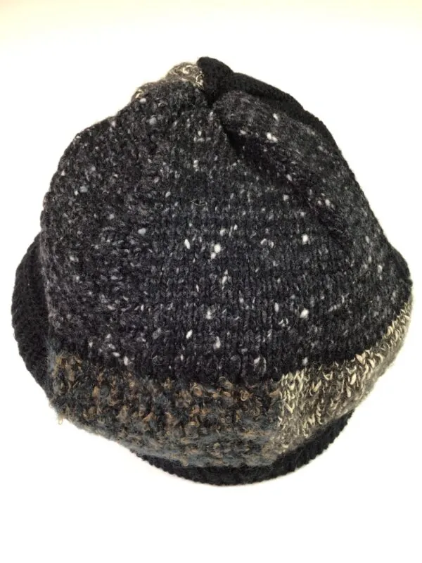 Wool, cotton and acrylic blend beanie hat in gray, black and white knit patches with a wide band, ribbed brim. One size. Dry clean. Made in Japan.