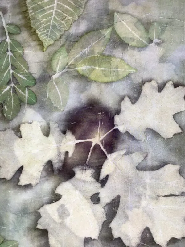 Margaret Erwin’s silk scarves are a labor of love as she forages for fallen leaves and flowers using them to print her designs using only natural dyes. Each one is unique. Hand wash, line dry. Light Oak, in soft tones of turquoise, green, copper. Measures 8″ W x 50″ L. Made in the USA.