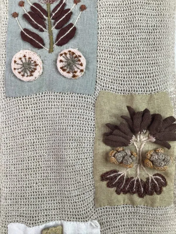 Sophie Digard’s scarves are a work of art, each is made of soft, fine,100% Merino wool. Known for her intricately hand crocheted patterns and color palettes of geometric and floral designs. This one is crocheted in a light beige background with square patches of embroidered and appliquéd colorful flowers, leaves and stems. Dry clean only. Size is 7″ W X 72″ L. Designed in Paris. Hand made in Madagascar.