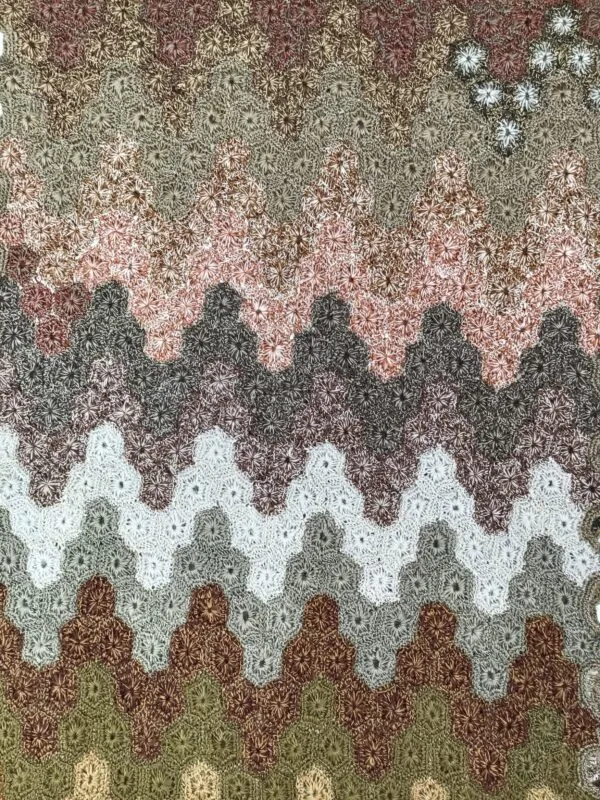 Sophie Digard’s scarves are a work of art. Known for her intricately hand crocheted patterns and color palettes of geometric and floral designs. Made of soft, fine,100% wool. This one has crocheted interlocking zig zag shapes in a rich, soft, multi-colored palate. Dry clean only. Size is 10.5″ W X 62″ L. Designed in Paris. Hand made in Madagascar.