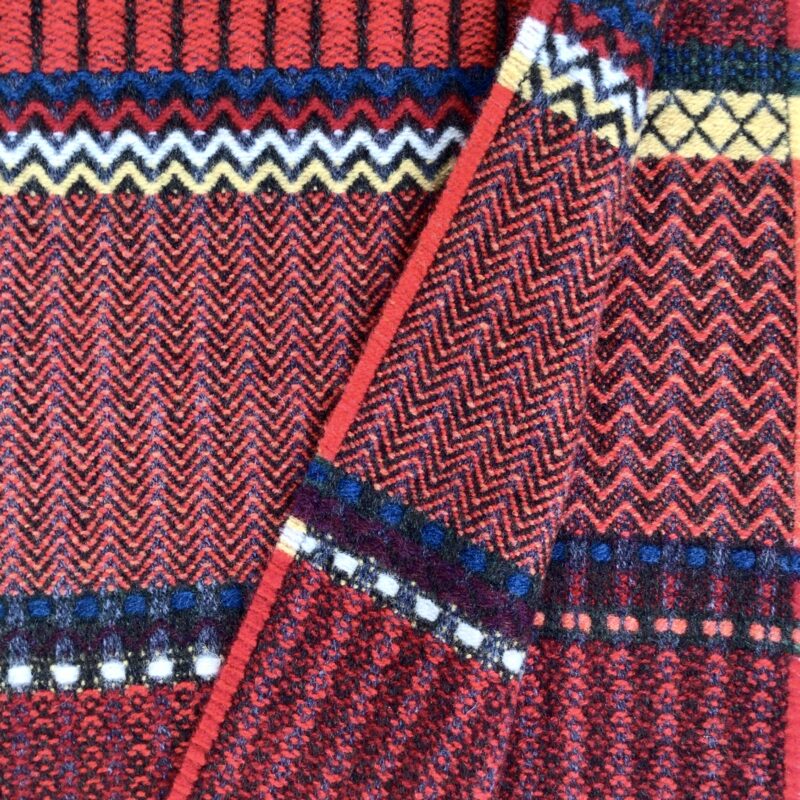 Cassia soft lambswool scarf, is woven in blocks and bands of differing patterns and widths in rich and soft colors with a 2.5 inch twisted thread fringe on each end. Size is 8.5″ W x 70″ L. Designed and woven in England.